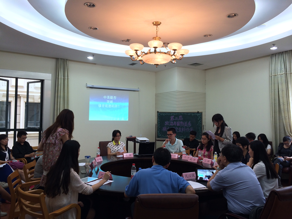 6月17日上午九点三十分,上海外国语大学松江校区图书馆T212会议室举行了第二届政治学专业硕士研究生辩论会。参与辩论赛的同学主要有我校国际关系、国际政治、外交学和中外政治制度专业的全体研一生和部分研二学生。国际关系与外交事务研究院常务副院长武心波教授、王联合副教授和左品博士作为评委也参加了此次辩论会。