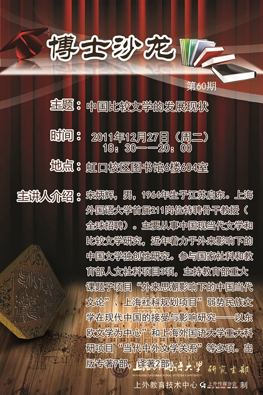 内容简介:本期沙龙宋教授将以“中国比较文学的发展现状”为题,介绍目前国内学科的热点话题及相关论点,同时结合《中国比较文学》期刊的背景、用稿要求,以及上外博士专业与学科的相关性,谈谈自己的看法。