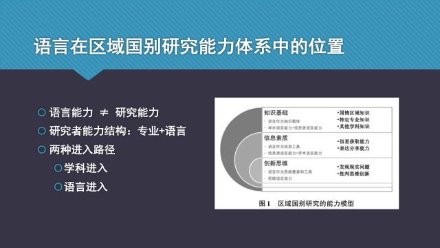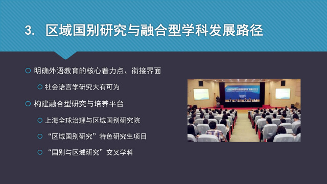 赵蓉晖同志以“区域国别研究”为主题,从该学科的“发展历史回顾”“与外语学科的关系”和“和外语学科的融合”三个部分将“区域国别研究”这一对接国家发展战略的交叉学科进行了介绍和分析。
