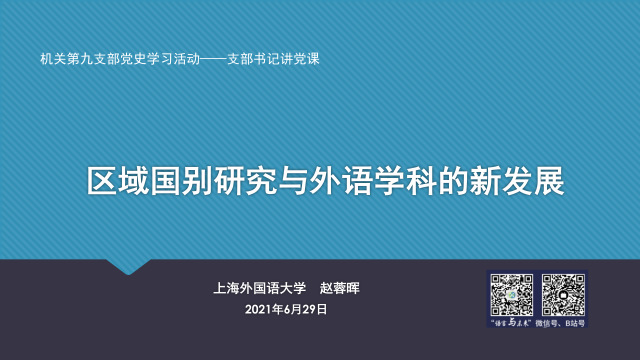2021年6月30日,为迎接“七一”建党百年,机关第九党支部支部书记赵蓉晖同志以习近平新时代中国特色社会主义思想为指导,结合个人学党史、悟思想的心得体会,结合高等教育事业的发展、国家“十四五”远景规划和上海外国语大学人才培养的发展目标,回顾建党百年来中国高等教育和外语学科发展的奋斗路、展望党领导下高等教育事业的奋进路,为支部全体党员上了一堂题为“区域国别研究与外语学科的新发展”的专题党课。