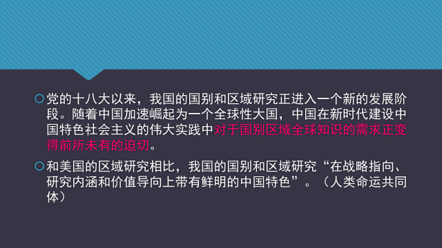 首先,赵蓉晖同志介绍了“区域国别研究”发展的历史,按照区域国别研究两大类别从“区域”“国别”导向和“模块”“问题”导向介绍了区域国别研究的发展历程。赵蓉晖表示:“‘国别与区域研究’作为一门学问,从其诞生之日起就具有独立的战略价值。世界主要大国无不从国家安全的高度,把国别与区域研究上升到国家战略层面,积极构建跟本国发展外部环境密切相关的国别、区域和全球知识体系。”