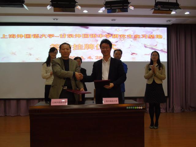 随后,查明建主任与刘国华校长热烈交谈,并互相表达了对于双方合作的欢迎与积极的看法。在甘泉全体高一学生的见证下,双方签署了上海外国语大学研究生实习基地协议,并共同为基地揭牌。