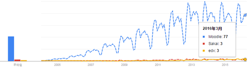 另附一篇2008年发表的《Moodle与Sakai 功能对比及对公共服务教学平台的启示》论文,其中对Moodle和Sakai的对比。应该说,目前Moodle超出Sakai更多了,从上表的趋势图中可以看出。