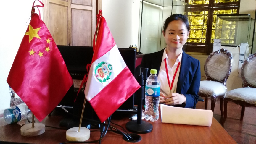 雨珊的工作主要分为两个部分:前期协助中国馆的布置工作;后期协助中拉文化交流年闭幕式会场工作。中国馆是中国赠送给秘鲁国家工程大学(La Universidad Nacional de Ingeniería)的一所图书馆。中国馆的设计有三大特点:首先非常具有中国特色,摆放有笔墨纸砚、书画、古色古香的坐垫、如意结样的书钉等;其次也体现了中秘两国之间的友谊,每一幅挂画上都印有两幅画,熊猫与羊驼、长城与马丘比丘、哈尼梯田与纳斯卡线等;最后还很现代化,馆内有两台海尔大电视和二十台电脑。书籍方面,中国一共赠送了中西英200多类书,总共10000多册。雨珊住的地方离UNI大学比较远,每天起早贪黑,和秘方工人、中方负责人加班加点地工作。负责人对中国馆的布置要求很高,大到馆内格局,小到每一本书的摆放,都是一改再改,尽全力做到最好。在整个布置工作中,最困难的是将10000多册书分类上架,一开始望着满地的书,他们都傻眼了:人手不足,这肯定不能按时完成工作啊!后来大家想到一个好办法:请学生和图书馆保安帮忙,人多力量大,在所有人的齐心协力下,终于按时高质量地完成了任务!21号上午两国文化部长在中国馆圆满完成了剪彩仪式。