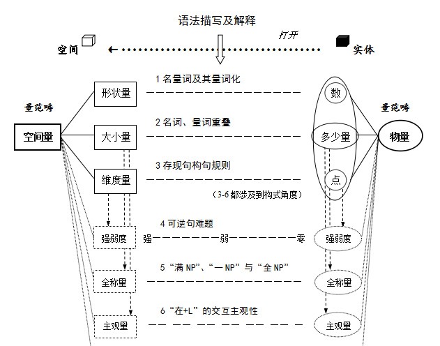黄健秦(2013)通过“空间量-物量”的糅合与剥离来建构“隐性空间量”,选取与形状量、大小量、维度量及其强弱度、全称量、主观性相关的六个个案进行讨论。但主要是描写汉语事实,没有上升到对共性、对类型的思考,整体框架也缺乏理论支撑。