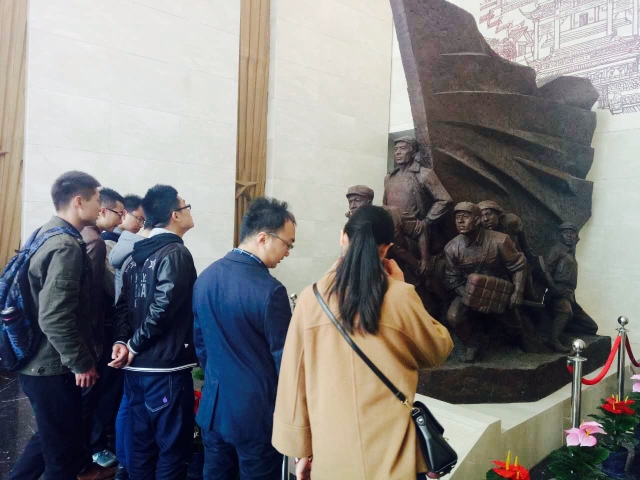 在学习过红旗纪念碑的深刻内涵后,大家前往位于陵园东北方的纪念碑文处和位于陵园西南方的展馆进行参观学习。展馆总共有两层,不同主题的展厅分散其中。一进正门,便是一座极具视觉震撼的烈士铜像,他们严肃的表情似乎在提醒我们“生于忧患,死于安乐”。展厅内部陈列依次介绍了侯绍裘、袁世钊、姜辉麟等烈士光辉的一生和英勇的事迹。党支部的各位同志们对他们勇于革新和勇于奉献的精神心生敬意,又为他们的舍身取义叹惋不已。支部党员沙旭沛同志说,在庄严肃穆的烈士陵园纪念碑下缅怀为自抗日战争以来为民族独立,人民解放和国家建设抛头颅洒热血的先烈们,这让他更加珍惜当下的时代,做一名合格的社会主义接班人。