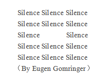 二战期间执掌于纳粹12年的德国文学于1945年面临着困境。经过两年的探索,Group1947带领德国文学突破“宣传工具”和“意识形态传播者”的定位。诗人,小说家等文艺工作者开始在公开场合,朗读自己的作品,并接受公众的批评。这个时期作品形式多样,语言形式较为灵活,主要内容为过去发生的事情,创作者自身经历及对战争的反思。以Eugen Gomringer的诗作Silence为例,原文如图: