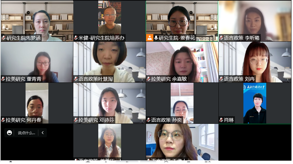 东华大学研究生院院长俞昊,复旦大学研究生院副院长先梦涵,上海全球治理与区域国别研究院副院长苏婧宇,语言研究院余华,上海全球治理与区域国别研究院教学秘书侯士瑞,研究生院副院长肖琳、江松及培养与国际化办公室全体成员参加了本次座谈会。欧亚文明研究、世界语言政策、拉美研究三个子项目共有19名毕业生参与了座谈交流。