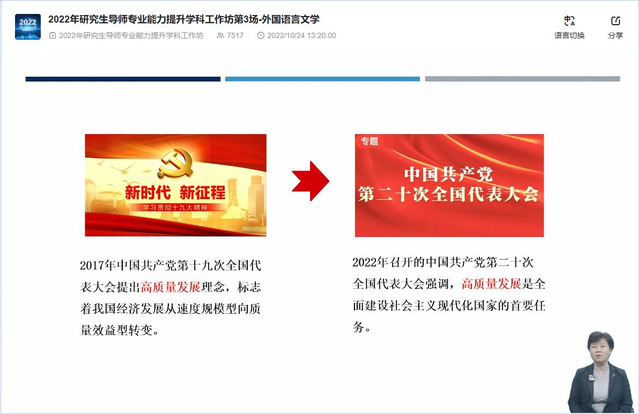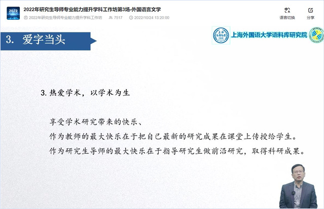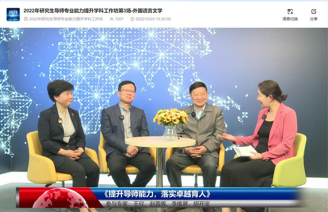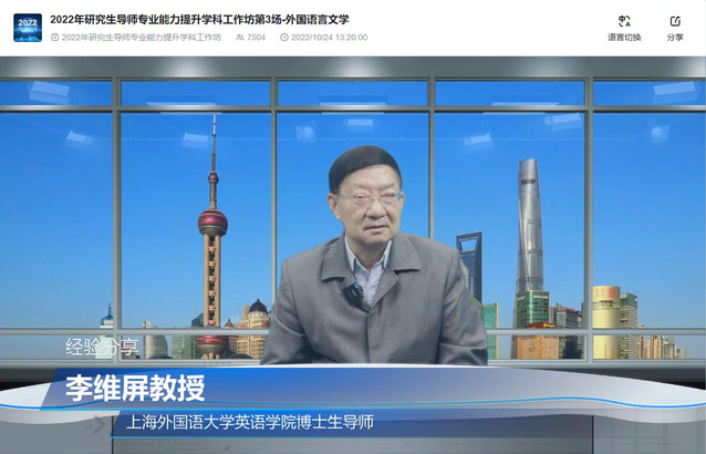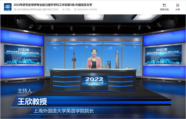 10月24日,由上海市教育委员会暨上海市学位委员会主办、上海市师资培训中心和上海外国语大学共同承办的2022上海高校“研究生导师专业能力提升学科工作坊”外国语言文学学科专场成功举办,活动关注度超过7300人次,上海市多所高校的外语院系组织收看,北京、浙江、山东、江苏、广东、福建的多家高校也专门设置会场组织收看,总关注度估计超过8000人次。
