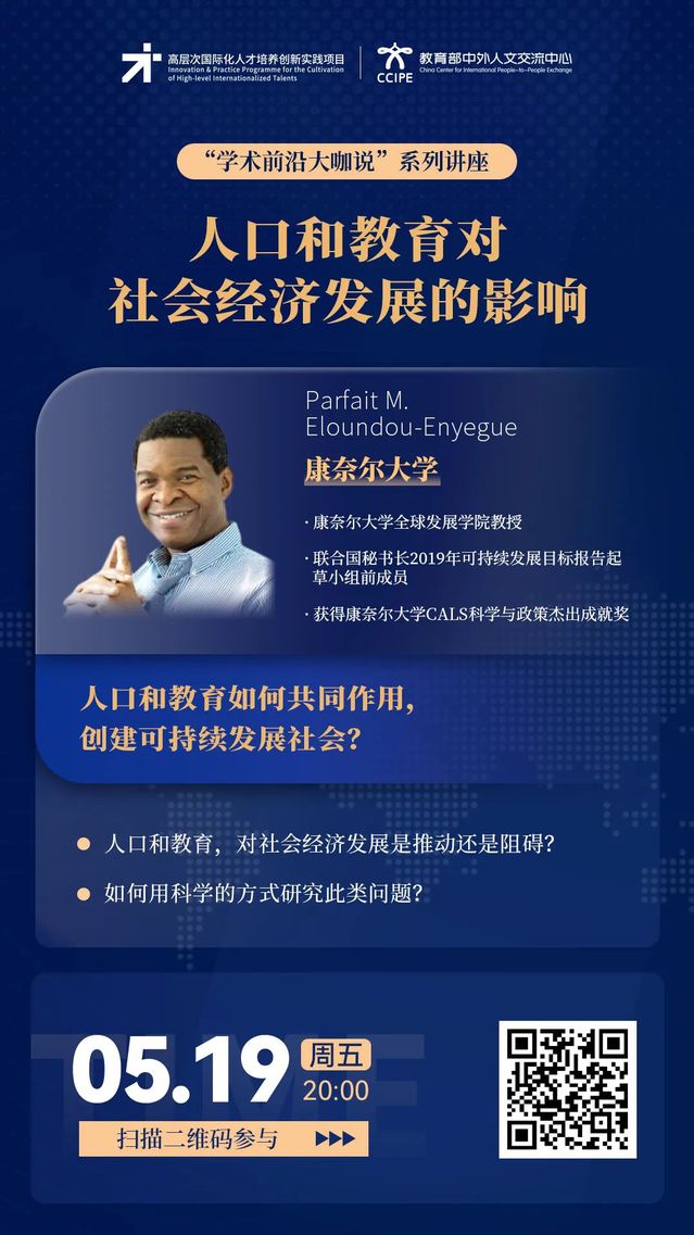 学术前沿大咖说 | 人口和教育对社会经济发展的影响 (5月19日20:00,主讲人:Parfait M.Eloundou-Enyegue)