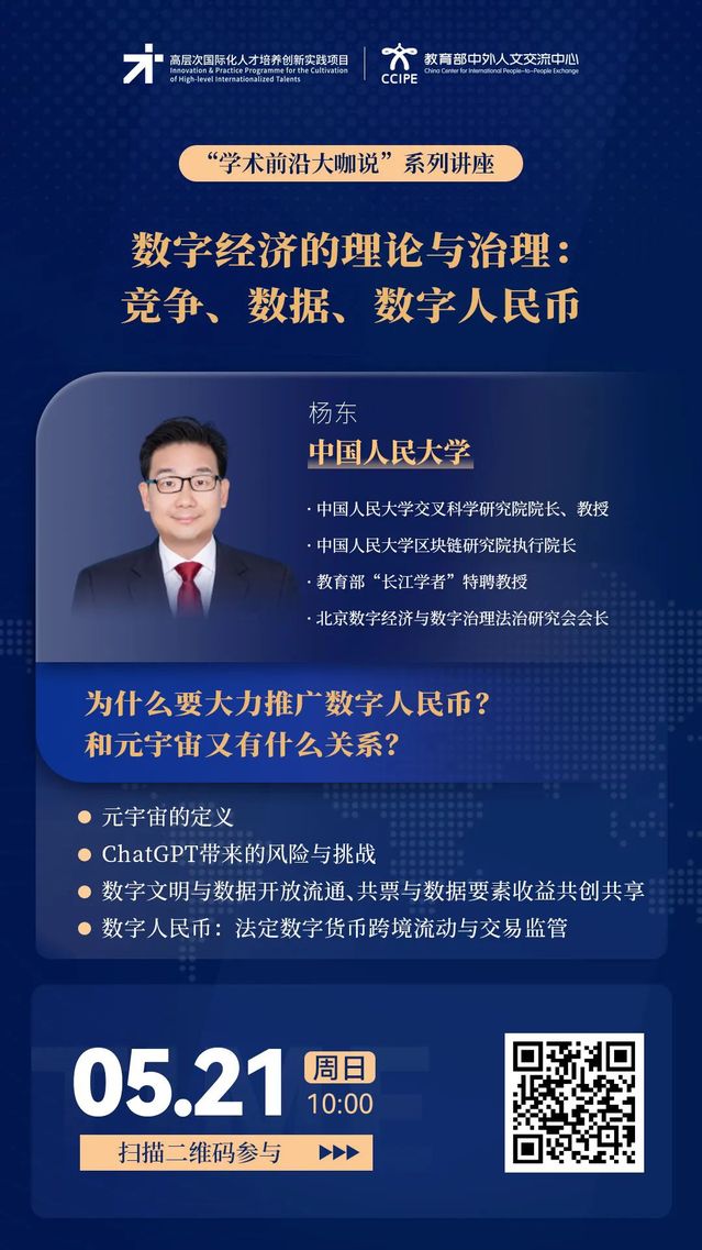 学术前沿大咖说 | 数字经济的理论与治理:竞争、数据、数字人民币 (5月21日10:00,主讲人:杨东)