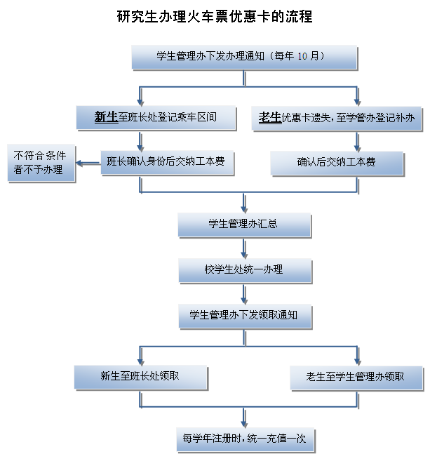 备注:火车票优惠卡每学年仅由学校统一办理一次,一般在每年10月左右进行信息登记,平时不予受理。
