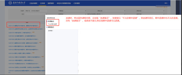 选课中不允许退课的课程会进行备注,请在选课时确认清楚,如下图。