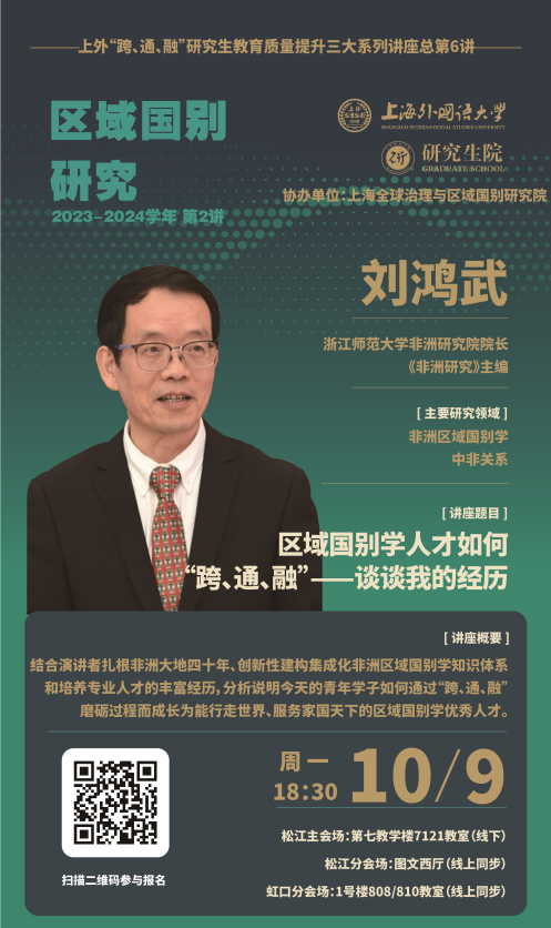 今天的青年学子如何通过“跨、通、融”磨砺过程而成长为能行走世界、服务家国天下的区域国别学优秀人才,10月9日(周一)下午18:30,浙江师范大学非洲研究院院长、《非洲研究》主编刘鸿武教授结合扎根非洲大地四十年、创新性建构集成化非洲区域国别学知识体系和培养专业人才的丰富经历,开启“区域国别研究”2023-2024学年的第二讲,为大家带来《区域国别学人才如何“跨、通、融”——谈谈我的经历》。