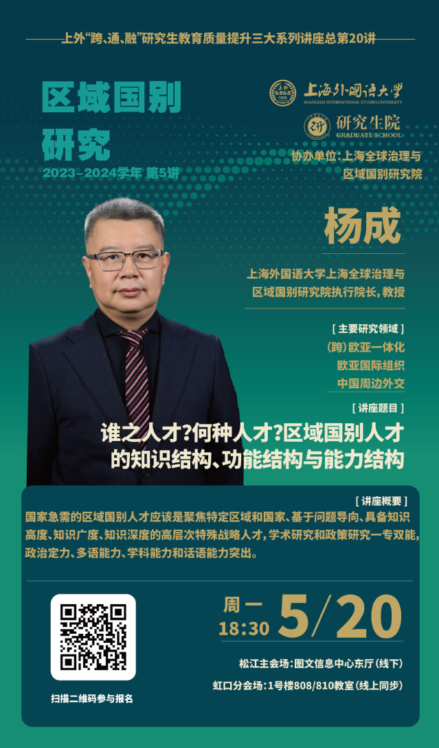 5月20日(周一)晚上18:30,上海外国语大学上海全球治理与区域国别研究院执行院长、博士生导师杨成教授,将为大家带来“区域国别研究”2023-2024学年第5讲《谁之人才?何种人才?区域国别人才的知识结构、功能结构与能力结构》。