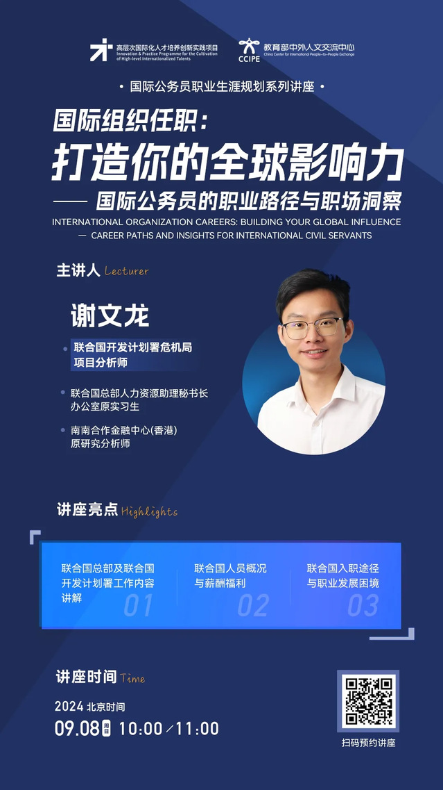 国际公务员职业生涯规划讲座 | 国际组织任职:打造你的全球影响力——国际公务员的职业路径与职场洞察(2024年9月8日10:00-11:00,主讲人:谢文龙)
