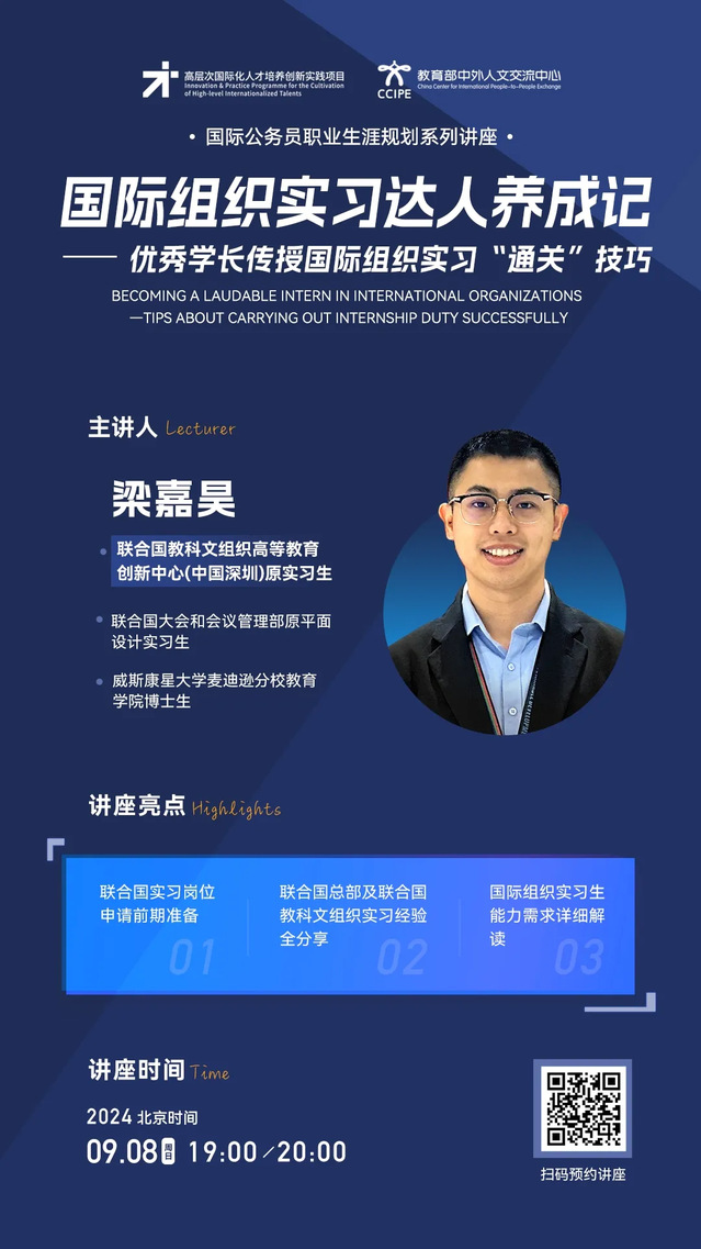 国际公务员职业生涯规划讲座 | 国际组织实习达人养成记——优秀学长传授国际组织实习“通关”技巧(2024年9月8日19:00-20:00,主讲人:梁嘉昊)