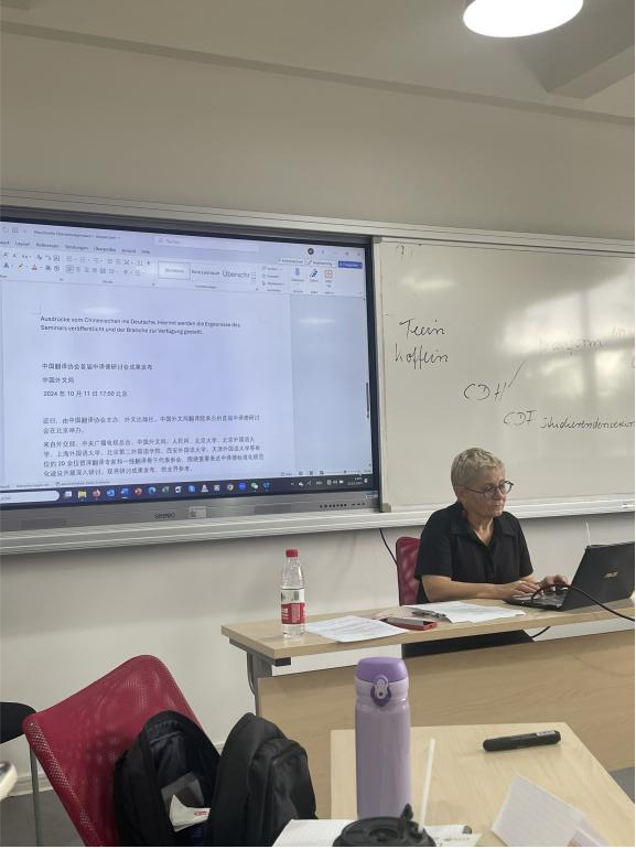 10月13日,上海外国语大学高级翻译学院举办两场翻译实践工作坊,邀请德国资深译者Andrea Schwedler围绕“实用文体汉德笔译的原则与方法”以及“宣传类文本汉德笔译的方法与思考”为德语口译专业的同学们分享了自己的翻译经验和思考、训练了汉德笔译能力、指导同学们合作和讨论来完成笔译任务。德语口译专业研一、研二、研三同学踊跃报名参加了此次活动。