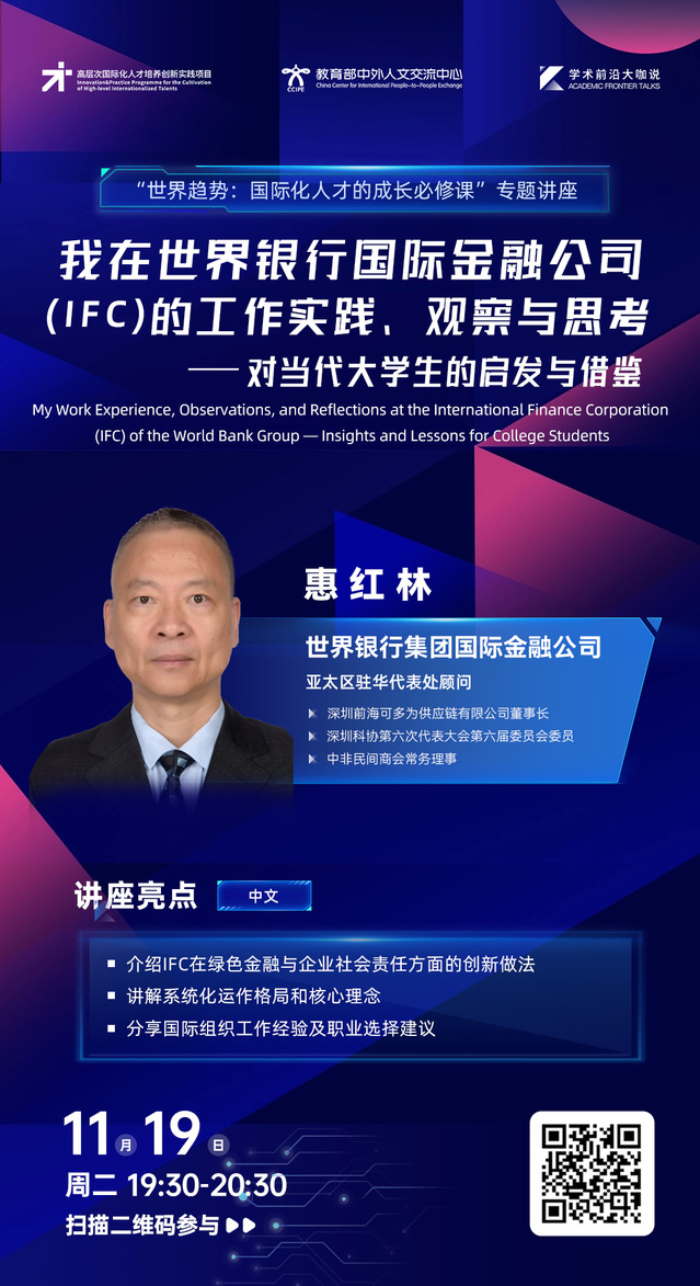 学术前沿大咖说 | 我在世界银行国际金融公司(IFC)的工作实践,观察与思考——对当代大学生的启发与借鉴(2024年11月19日 19:30-20:30,主讲人:惠红林)