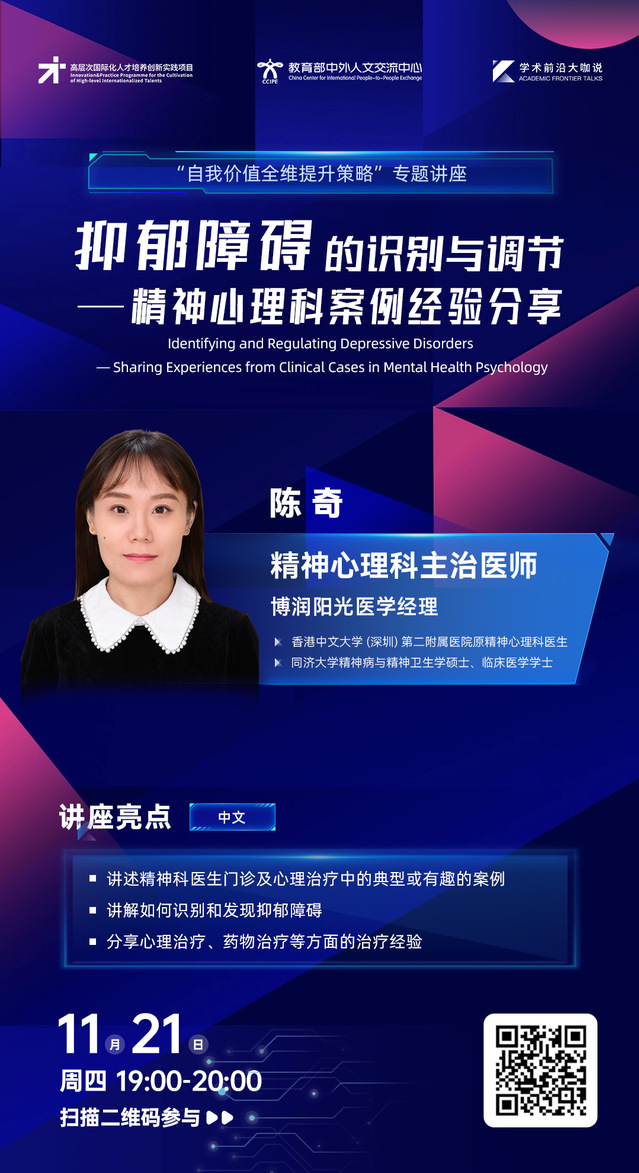 学术前沿大咖说 | 抑郁障碍的识别与调节——精神心理科案例经验分享(2024年11月21日 19:00-20:00,主讲人:陈奇)