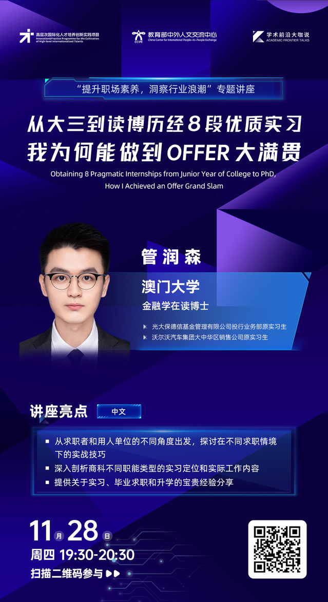学术前沿大咖说 | 从大三到读博历经8段优质实习 我为何能做到OFFER大满贯(2024年11月28日 19:30-20:30,主讲人:管润森)