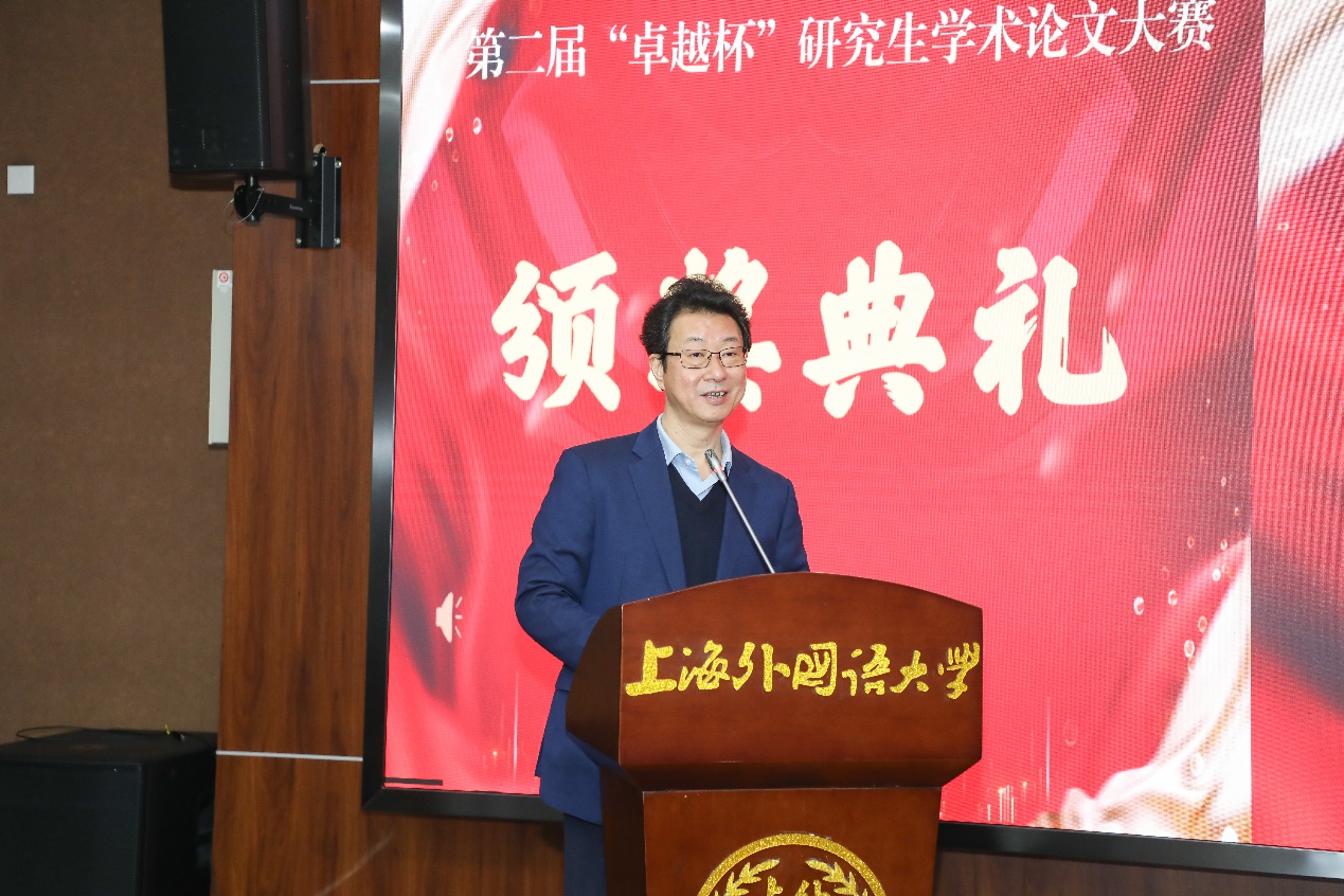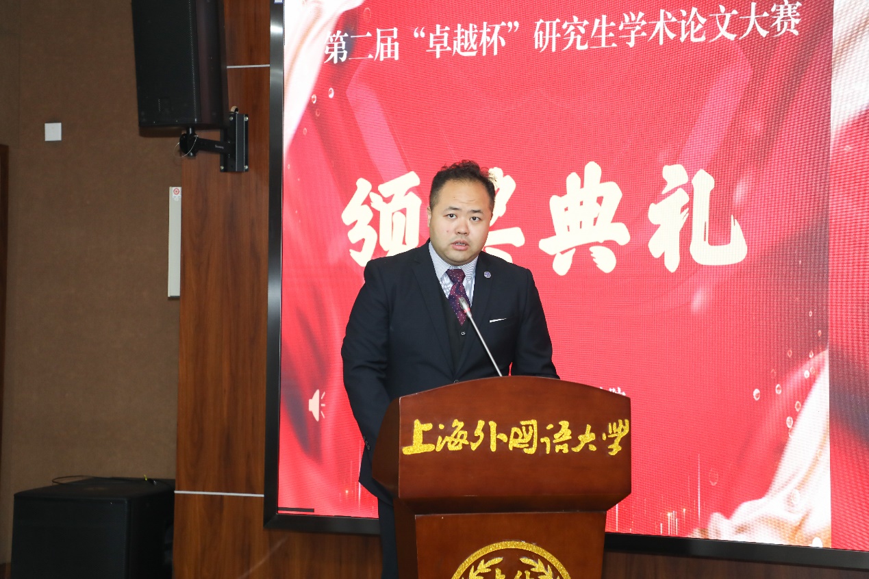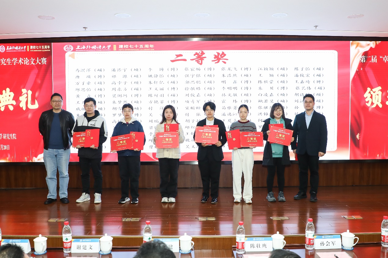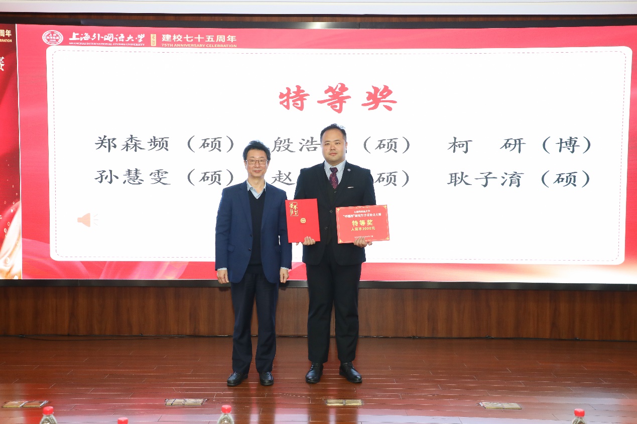 研究生院副院长江松宣读了获奖学生名单,本次大赛共评选特等奖6篇、一等奖20篇、二等奖83篇。副校长查明建、研究生院院长陈壮鹰、德语系党委书记谢建文、国际教育学院副院长窦心浩、国际金融贸易学院副院长凌爱凡、日本文化经济学院副院长盛文忠、法学院党委副书记宋亮、语言科学研究院院长助理耿强分别为获奖同学颁奖。