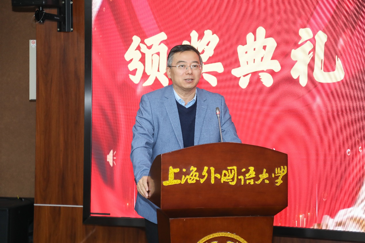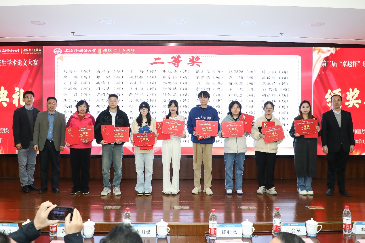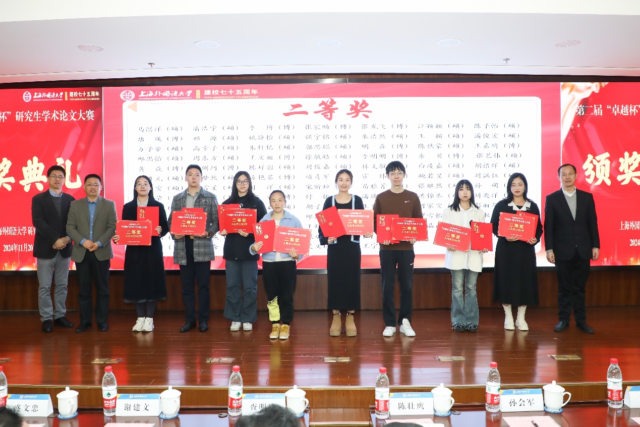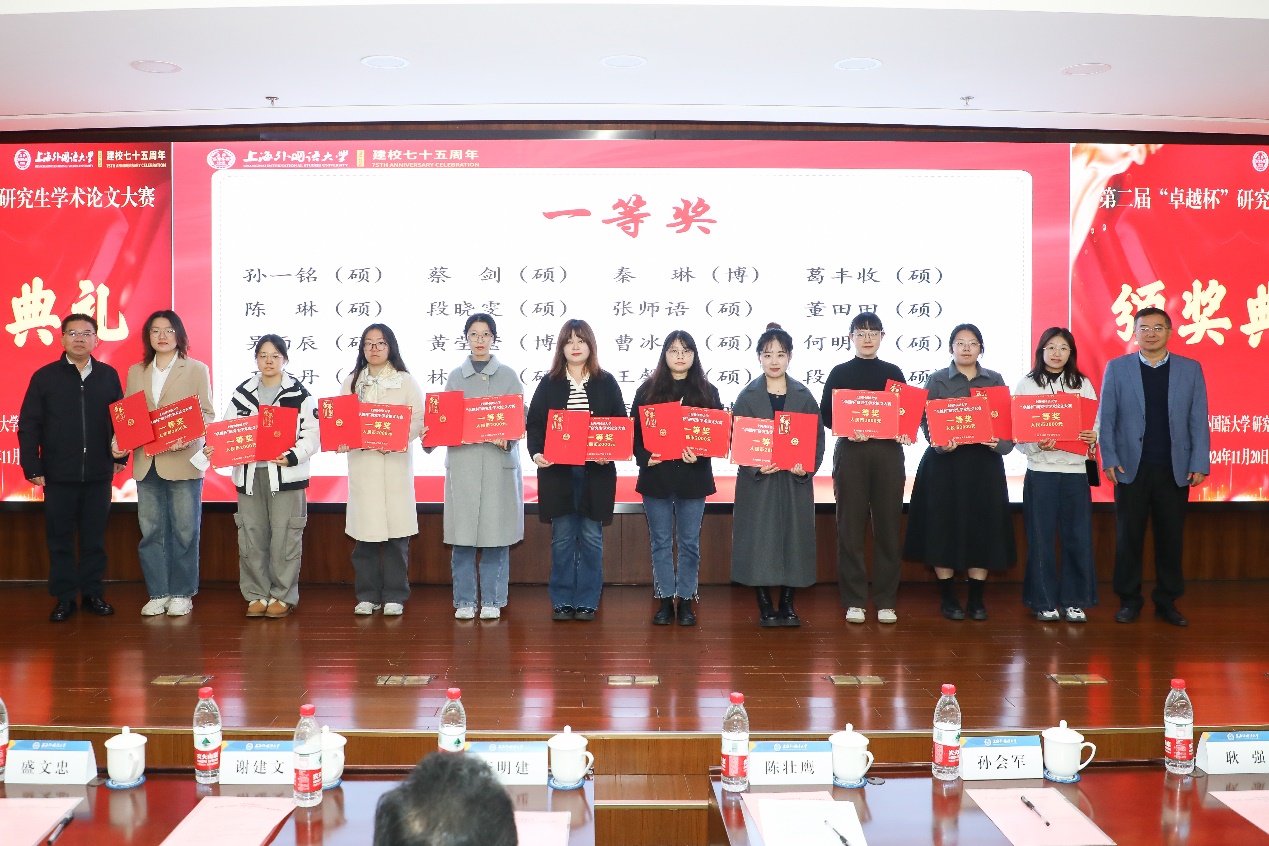 研究生院副院长江松宣读了获奖学生名单,本次大赛共评选特等奖6篇、一等奖20篇、二等奖83篇。副校长查明建、研究生院院长陈壮鹰、德语系党委书记谢建文、国际教育学院副院长窦心浩、国际金融贸易学院副院长凌爱凡、日本文化经济学院副院长盛文忠、法学院党委副书记宋亮、语言科学研究院院长助理耿强分别为获奖同学颁奖。
