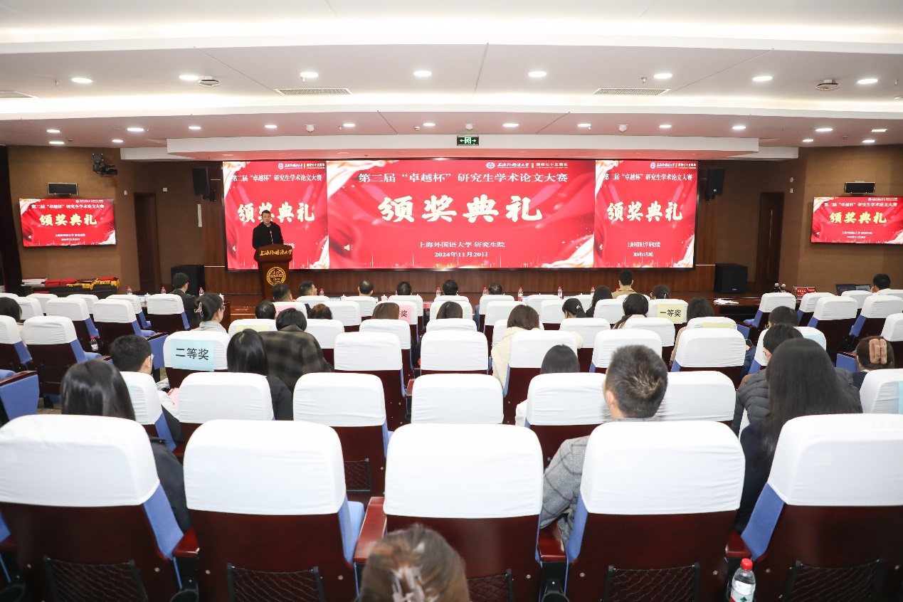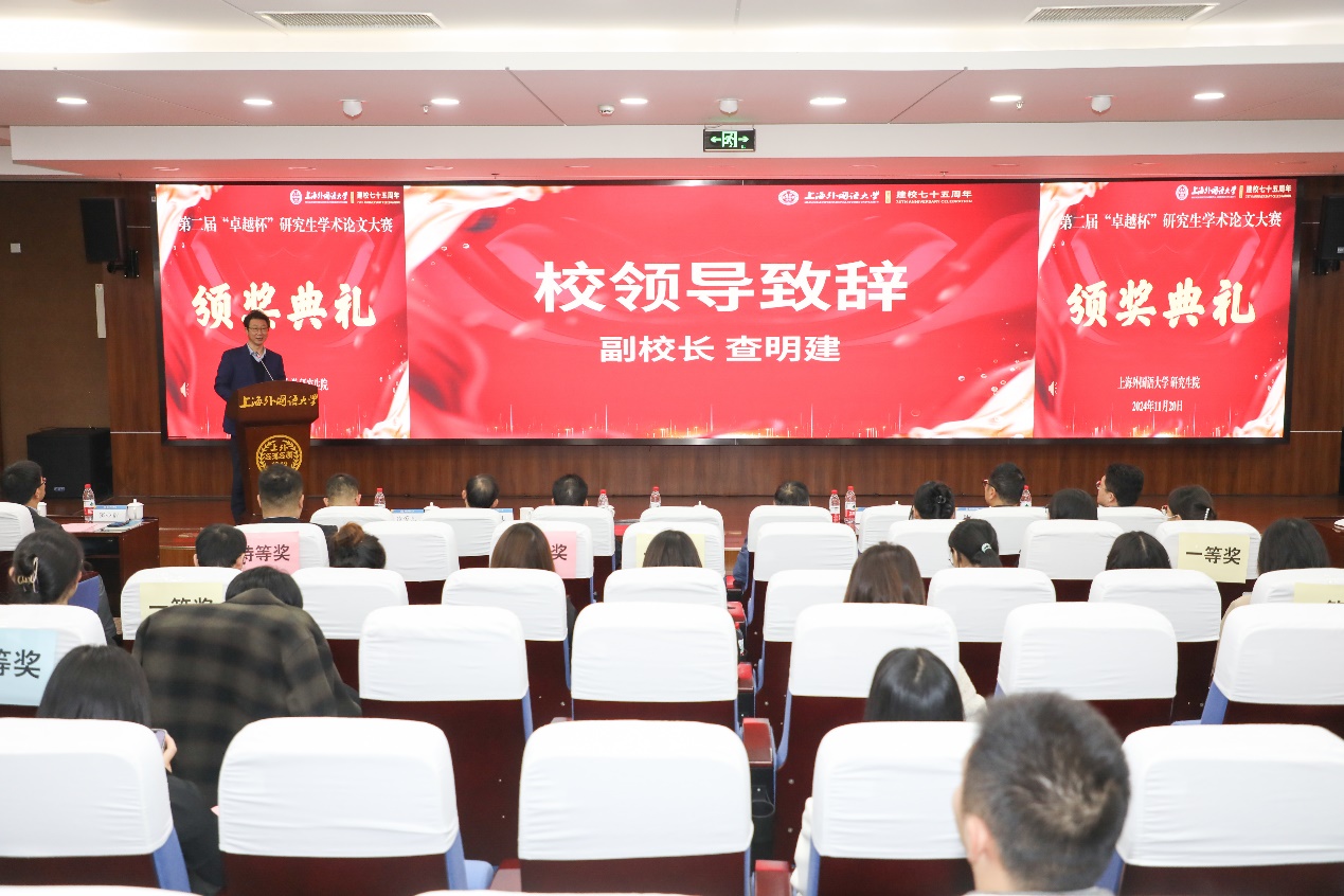 2024年11月20日下午,学校第二届“卓越杯”研究生学术论文大赛颁奖典礼在松江校区国际教育中心一楼报告厅隆重举行。副校长查明建出席典礼,研究生院院长陈壮鹰、各研究生培养单位研究生教育分管领导,研究生教学、科研秘书与获奖学生代表参加了本次活动。典礼由研究生院副院长江松主持。