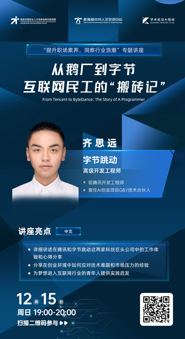 学术前沿大咖说 | 从鹅厂到字节:互联网民工的“搬砖记”(2024年12月15日 19:00-20:00,主讲人:齐思远)