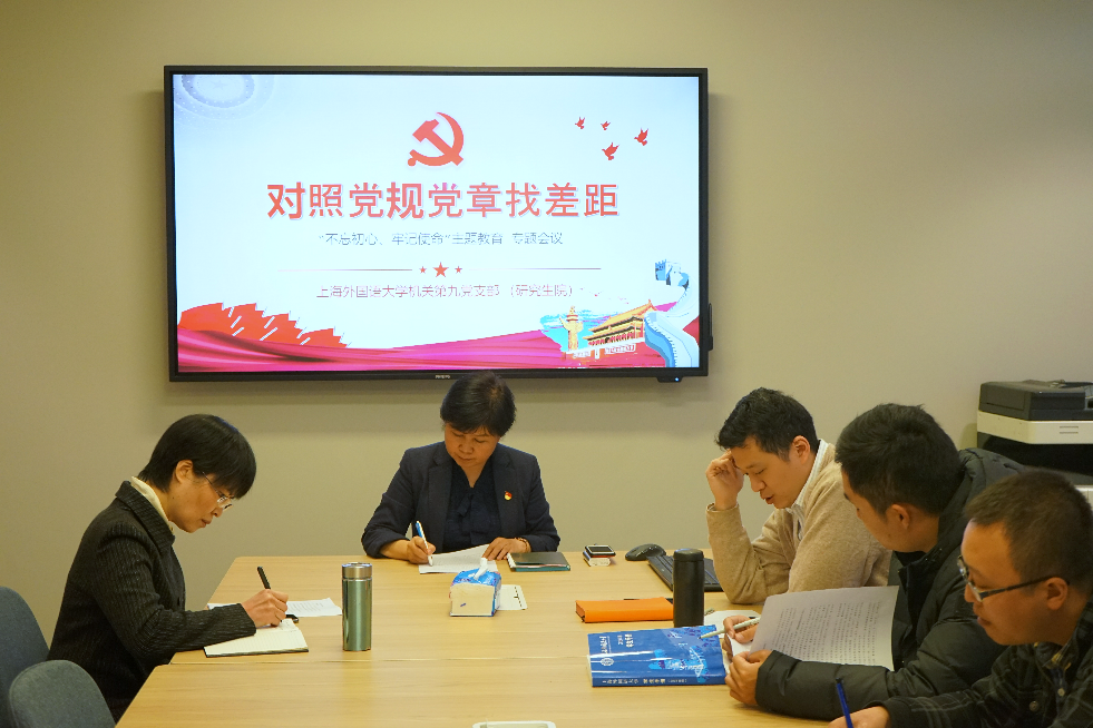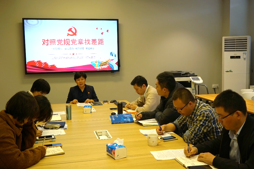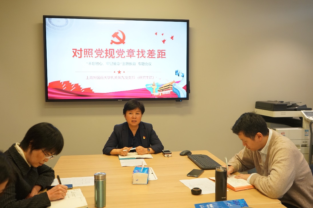 按照校组织部“不忘初心、牢记使命”主题教育领导小组统一部署,机关第九党支部召开对照党章党规找差距专题会议。机关第九党支部书记、研究生院院长赵蓉晖教授主持会议并讲话,强调要深入学习贯彻习近平总书记关于“不忘初心、牢记使命”的重要论述,坚持学深悟透、查改贯通、学做结合,学好用好党章党规,持续砥砺初心使命,努力把党章党规要求体现到推动高质量发展的实际行动上,落实到促进上海外国语大学“双一流”建设和研究生教学培养“立德树人”的实践中来。