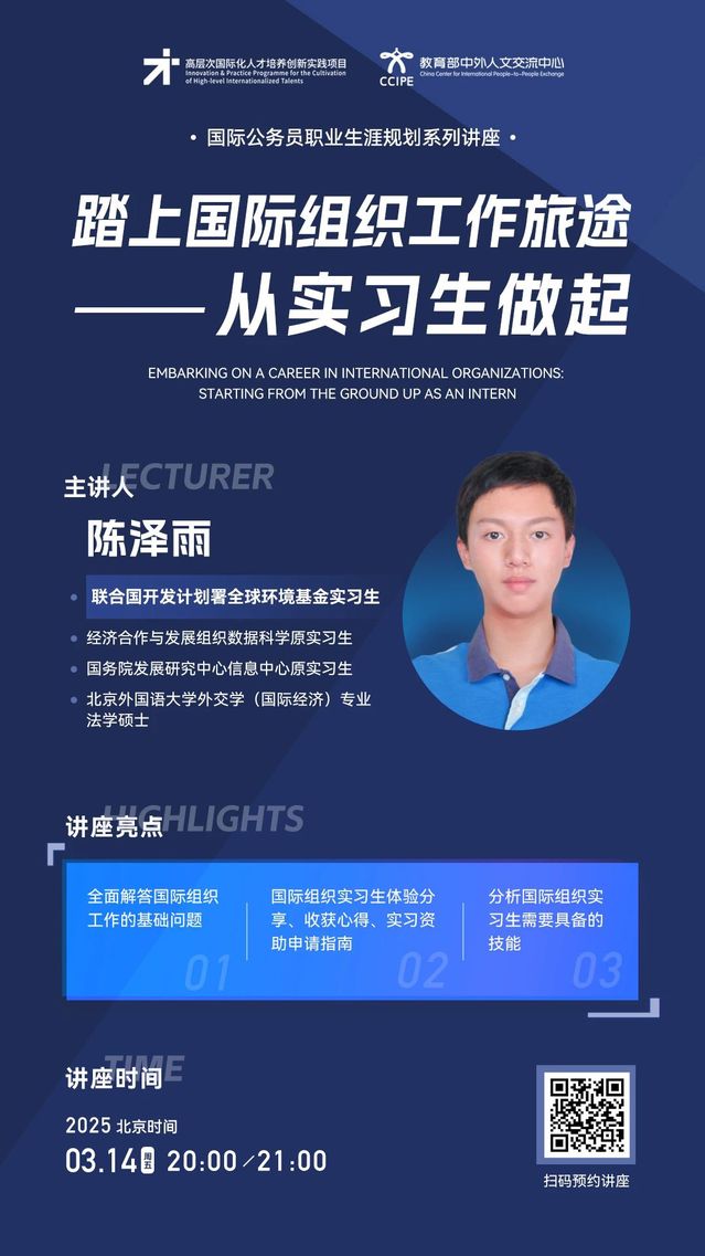 国际公务员职业生涯规划讲座 | 踏上国际组织工作旅途——从实习生做起(2025年3月14日20:00-21:00,主讲人:陈泽雨)
