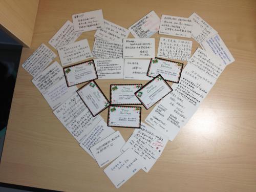 平安夜前几天,班委王晓璇、骈曼和郝洋就前去购置平安果。为了让班级同学能够得到其他同学的真挚祝福,我们特地准备了祝福小卡片并在卡片上写上班级每个同学的姓名,平安夜前一天我们让每个人抽取一张卡片然后给卡片上的同学写一段祝福,等大家写好后我们再把卡片收集起来。24号下午我们把平安果连同大家写好的祝福小卡片放进一个个精致的包装盒里,并且把所有的盒子摆成了心形。为了让大家都能看到我们满满的心意与祝福,我们要每个同学亲自来领取平安果,当大家进门看到那个大大的爱心时都非常惊讶,领到了红彤彤的平安果,看到了卡片上的祝福,大家心里都暖暖的。