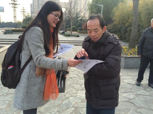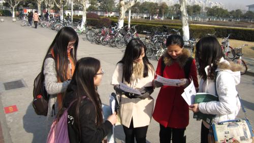 之后,同学们又去到了地铁站附近的市民广场,向在广场上散步和休息的市民们分发了保暖小贴士。大部分市民都欣然接受了单页,老人们还聚到了一起,和同学们交流起了保健知识。也有一些市民起初抱着怀疑的态度,以为是广告推销,但同学们带着善意的微笑,耐心说明了自己是上外的研究生,介绍了本次送温暖活动,得到了市民的信任和感谢。令人印象深刻的是,一位水果店的老板在接受了同学们的单页后,向自己的妻子转述了这些知识,并且赞叹了一句:“好贴心呀。