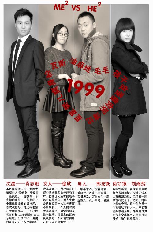 时间只能改变一个人的容颜,而现实则能掏空人的心。一对爱人是如何被现实剥离得只剩空壳,以至彼此不再相识?当过去的影子终于和现在的自己重逢,这场超现实的对话又将会扬起多少荒诞的谎言和混乱的尘埃?上外研会话剧社2014级新人大戏《我和我和他和他》,诚邀每个渴望得到答案的人,一起参与这场心灵的拷问。