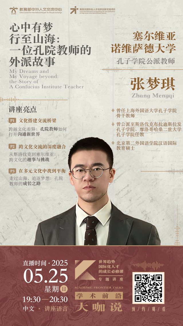 学术前沿大咖说 | 心中有梦,行至山海——一位孔院教师的外派故事(2025年5月25日 19:30-20:30,主讲人:张梦琪)