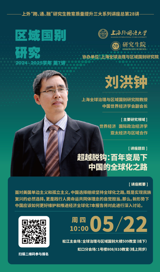5月22日(周四)上午10:00-11:30,上海外国语大学上海全球治理与区域国别研究院博士生导师、志远领军学者、教育部新世纪优秀人才刘洪钟教授将为大家带来“区域国别研究”2024-2025学年第7讲《超越脱钩:百年变局下中国的全球化之路》。