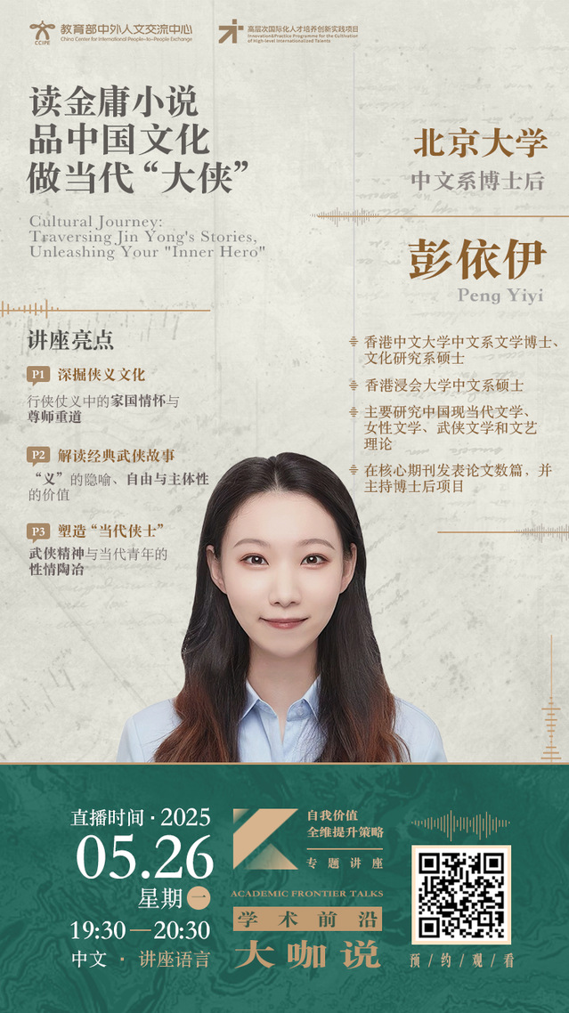 学术前沿大咖说 | 读金庸小说,品中国文化,做当代“大侠”(2025年5月26日 19:30-20:30,主讲人:彭依伊)
