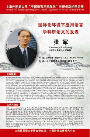 主讲人:Lawrence Jun Zhang张军(新西兰奥克兰大学教授) 时间:2015年11月10日(周二)14:00-16:00 地点:上外虹口校区图书馆606报告厅 主办单位:上海外国语大学语言研究院、中国外语战略研究中心 内容摘要: Writing is a challenge facing many emergent scholars. The challenge is exacerbated for non-native English-speaking writers, who, on the one hand, have to juggle linguistic demands, and on the other hand, consider the logical organisation for expressing the intended meanings coherently. Issues germane to such a challenge probably relate to non-native English-speaking writers’ lack of genre awareness, discourse knowledge, rhetorical disparities, and any other minor but significant aspects that affect reader-reviewer-editor judgement about the quality of the work presented in a submitted manuscript. Such a challenge, in all likelihood, is greater for Chinese linguistics and applied linguistics scholars who have limited access to international journals to which they can potentially contribute their research articles. Come and join Dr Zhang in this seminar, where he will share his personal experience as co-editor of TESOL Quarterly (SSCI), an editorial board member of several leading journals, The Applied Linguistics Review (SSCI), Journal of Second Language Writing (SSCI), System (SSCI), Metacognition and Learning (SSCI), and a reviewer for a number of eminent journals such as Language Learning, Applied Linguistics, The Modern Language Journal, Language Teaching Research, and Assessing Writing.He will present an overview of a range of journals for possible publications and share strategies for success. A Q&A segment will follow, which will allow audience to interact with the speaker. 主讲人简介: 张军(Lawrence Jun Zhang, PhD)博士现任新西兰奥克兰大学博士生导师及博士后导师、教育学院课程与教学论系应用语言学正教授、教育学院副院长(国际关系)。张军教授主要从事二语习得、元认知、学习策略、二语写作、阅读教学设计和外语师范教育方面的研究。在国内及国际性学术刊物及会议文集发表论文及述评100余篇。张军教授现为新西兰应用语言学学会执行委员会执行委员/常务理事/秘书长。现任中国外语写作教学与研究会理事、新西兰应用语言学学会(ALANZ) 秘书长、TESOL Quarterly学刊(SSCI-源刊) 副主编、《元认知与学习》Metacognition & Learning (Springer, New York, USA) (SSCI-源刊)、《系统:教育技术与应用语言学国际期刊》System: An International Journal of Educational Technology and Applied Linguistics (Elsevier, Oxford, UK) (SSCI-源刊)、The Applied Linguistics Review《应用语言学评论》 (SSCI, de Gryuter, New York & Germany)、 Journal of Second Language Writing《第二语言写作研究学刊》(SSCI)、《中国应用语言学》Chinese Journal of Applied Linguistics 国际编委 (de Gryuter, USA and Germany)、《区域英语教学期刊》RELC Journal国际编委 (Sage, London & Singapore) ,及Writing and Pedagogy《写作及教学》(Equinox, UK)等国际期刊编委。