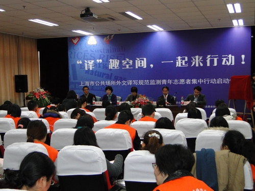12月21日上午,由市语委、市教委、团市委联合主办,市教育督导事务中心(市教育行政执法事务中心)、上海青年志愿者协会协办的“‘译’趣空间,一起来行动!——上海市公共场所外文译写规范监测青年志愿者集中行动启动仪式”在我校虹口校区图书馆报告厅举行。市语委、市教委副主任袁雯,副校长、校语委主任冯庆华等出席仪式并讲话。来自上海外国语大学、复旦大学、同济大学、华东师范大学、华东政法大学、上海对外贸易学院等高校的60余名志愿者代表,以及本市各区县语委办负责人参加仪式活动。 首先,冯庆华代表上海外国语大学向各位参会领导和嘉宾致欢迎辞。冯庆华在致辞中回顾了我校在2010年世博会和2011年上海世游赛等重大赛会中开展的外文译写规范监测活动,并指出,开展此类公共场所外文译写规范监测行动,符合我校建设“国际化、有特色、高水平、多科性、国际知名、国内一流的外国语大学”的目标,同时为我校学子成长为专业知识扎实、具备综合能力,具有国际水平的高素质复合型人才提供了锻炼机会。 仪式上,团市委青年志愿者工作部负责人为公共场所外文译写规范监测青年志愿者服务队授旗。今后,志愿者将以英、日、韩、俄等四个语种为主,定期在主要商业街区、重点交通枢纽等公共区域开展“译”测服务。袁雯和冯庆华共同为设在市教育督导事务中心(市教育行政执法事务中心)的“上海市公共场所外文译写规范监测志愿者培训与研究基地”揭牌,该基地的主要职能是对志愿者进行业务培训、开展相关政策研究、加强交流合作,为外文译写规范监测志愿者工作提供强有力的理论支撑和智力保障。 最后,袁雯作了总结讲话。她在讲话中指出,通过志愿者行动加强公共场所外文译写规范的监测与管理,是上海语言文字工作以及城市整体建设的重要任务。市语委、市教委将不断完善长效管理机制,整合英文专家、大学生志愿者、市民志愿者、整改执法人员等四支工作力量,不断提高外文译写规范工作的能力和水平。 据了解,此次启动的“译”志愿行动还将作为团市委“联合国上海志愿服务发展项目”的专题领域予以扶持,参与服务的志愿者团队将接受来自联合国志愿服务机构和本市相关机构的“联合培育”,通过建立骨干梯次队伍、推出微博“译”助平台、拓展跨省市联动交流等机制,探索推广以志愿服务形式参与社会建设的实践模式,为促进全市公共场所外文使用规范做出积极贡献。相信在接下来的志愿行动中,我校一定会发挥自身优势,全力支持配合本次活动的开展,也相信上外学子能够继续抱着严谨、负责的态度,以专业服务的精神,开展规范监测活动,为上海市国际语言环境建设贡献自己的一份力量。(团委) |