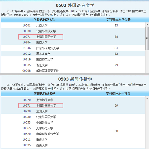 2013年1月29日上午,教育部公布了2012年学科评估结果,上海外国语大学外国语言文学学科整体水平得分为88分,在该学科92所参评高校中得分第2位(排名第2)。上海外国语大学新闻传播学学科整体水平得分为69分,在该学科48所参评高校中得分第11位(排名第27)。 (相关链接:http://www.chinadegrees.cn/xwyyjsjyxx/xxsbdxz/index.shtml)