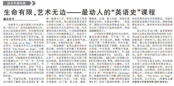 《文汇报》报道我院朱磊老师及其“英语史”课程编者按:在许多上外学子心目中,语言研究院的朱磊老师是“神一样的存在”。他会英语、法语、德语、俄语、阿拉伯语、波斯语、韩语、泰语、拉丁语、希腊语、土耳其语等等……还曾负笈剑桥深研藏语。传说他可以授课的语言有八种,能够交流的有十多种,会的就更数不清楚了。然而,朱师的“神”不仅在于他对古往今来各种语言的掌握,更在于他的超然淡泊,永葆那份美好纯粹的初心,深深感染着每一位学生…… 2015年3月5日,《文汇报》教育版报道了我院朱磊老师及其“英语史”课程,全文如下: