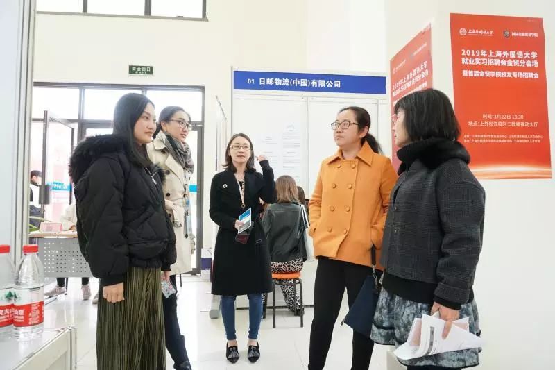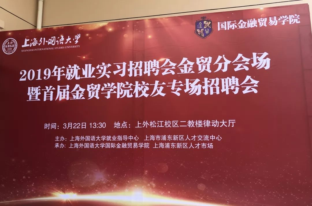 3月22日下午,2019年上海外国语大学就业实习招聘会金贸分会场暨首届金贸学院校友专场招聘会在二教楼律动大厅如期举行。在浦东新区人才交流中心、浦东新区人才市场、学校就业指导中心的大力支持下,33家企业报名参加,为同学们提供包含国际贸易、金融、会计专业相关的一百五十余个工作、实习岗位,满足同学们多元的就业需求和就业选择。学院也同时为低年级同学精心准备了包括简历修改、面试攻略、生涯规划辅导等在内的职业发展服务。招聘会现场人头攒动,同学们收获颇丰,活动取得圆满成功。