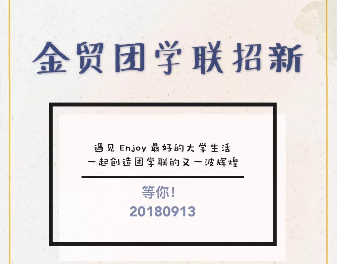 活动简介:金贸团学联向2018级的新生们发出最诚挚的邀请,通过宣讲会介绍团学联9大部门的工作内容和职能,激发大家对团学联的活动的兴趣。同时,希望有才华、有能力、想要挑战自我、想在大学校园生活中留下浓墨重彩一笔的大家踊跃报名,团学联需要新生力量的加入!金贸团学联等你~