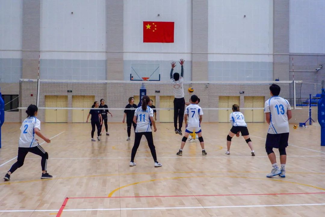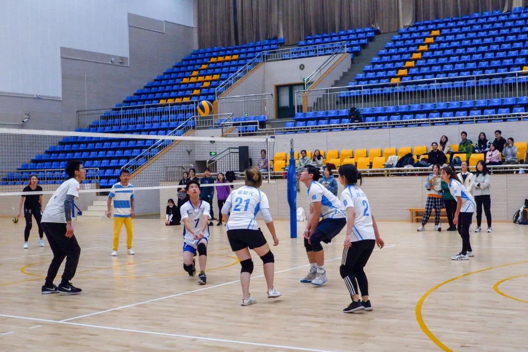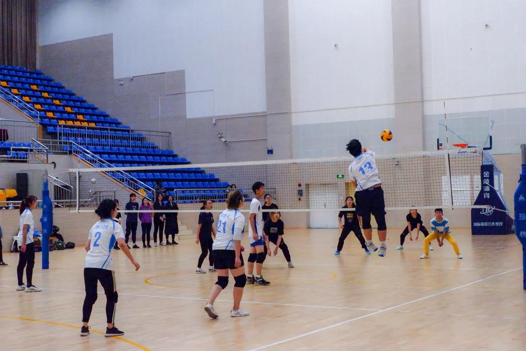 师活室内球馆,排球联赛正式开战!比赛双方为金院排球队和英院排球队。双方队员握手之后,比赛于16时43分正式开始。开局由英院先发球,连得两分后金院把握了主动权,组织起了攻势,连得八分。随后局势十分焦灼,双方互有攻守,接连贡献到位一二传和精彩扣球,比分来到了21平,最终还是金院选手保持状态,抓住机会接连下分,25比22,第一局由金院拿下。
