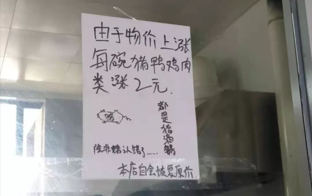 同学们喜(wu)闻(ke)乐(nai)见(he)并亲身体验到了物价上涨,例如最近宿舍区早餐店的鲜肉小馄炖等涨价20%,让本就捉襟见肘的我们:“还是葱油拌面吧。”