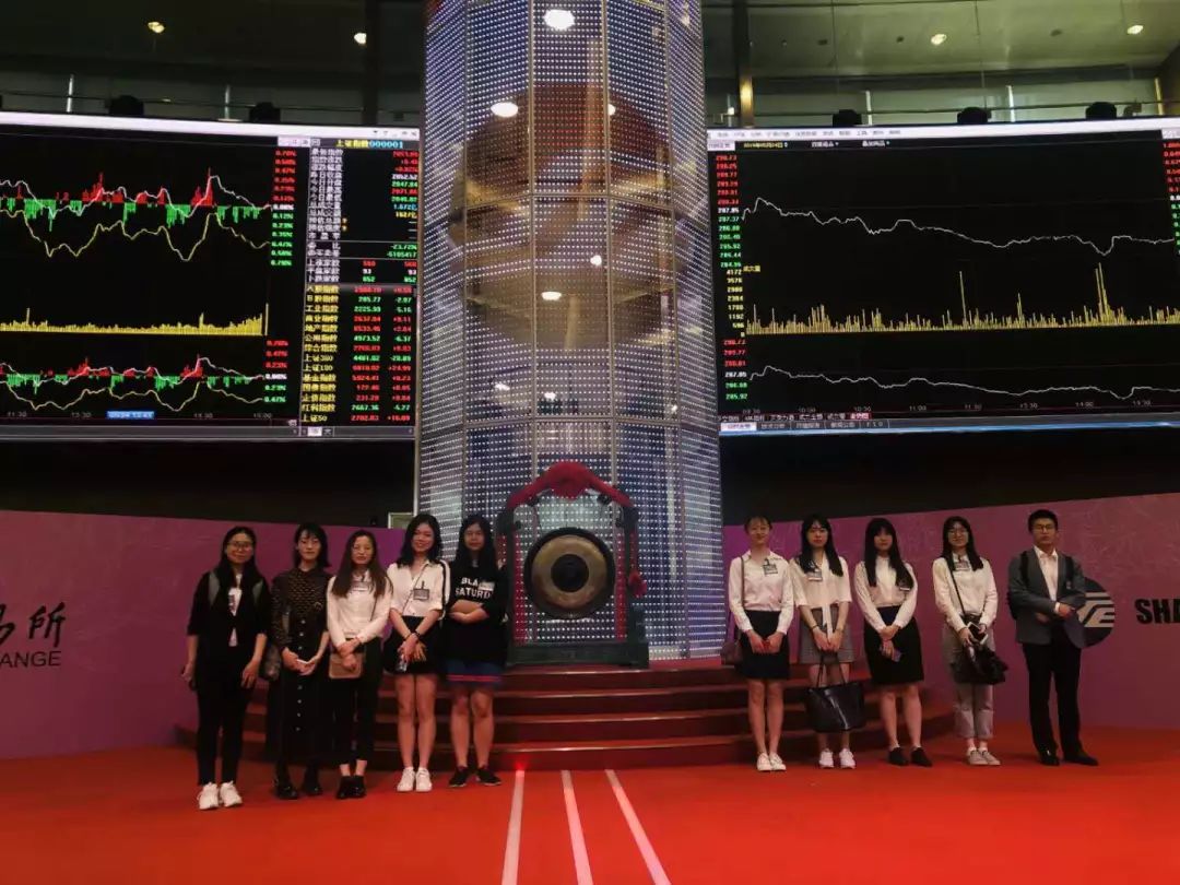 炎热的空气一路伴随着大巴与同学们同行,而到了上交所迎接大家的就是清凉。工作人员礼貌地接待了到访同学,给每个人发放了参观证。进入上交所后,首先吸引大家的就是高高悬挂着的电子屏幕上显示出的红绿交织的股票走势图,它蕴藏着这个金融市场里令人着迷的玄机和奥秘,仿佛一张数字迷宫图,等待着同学们学成之后利用自己的专业知识将所有暗语一一解开。悬挂在会议大厅里的古朴铜钟是上交所的另一标志性装饰,它像一位久经沧桑的老人,见证着上交所的重要时刻,也见证着中国股市的跌宕起伏。