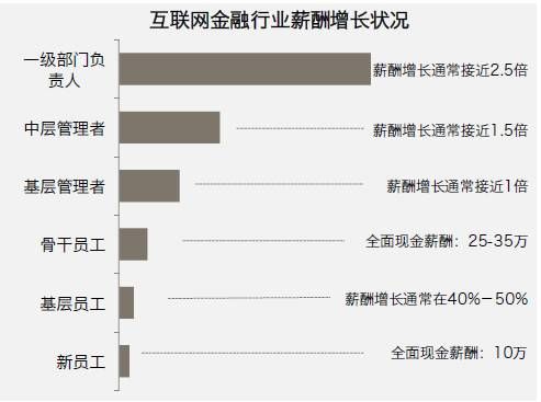 领英、怡安翰威特发布的《2016年中国互联网金融人才白皮书》称,互联网金融行业新员工的起薪水平通常在10万年薪左右,具有2--3工作经验的熟手通常能够实现收入上涨50%,骨干员工的收入水平在25万一35万之间,主管的收入水平约为45万。从员工向二级门负责人晋升通常也意味着近一倍的薪酬涨幅,达到65万左右,而成为一级部门副职已能获得百万年,一级部门负责人则通常会有2.5倍的增长,达到250万的平均年薪水平。