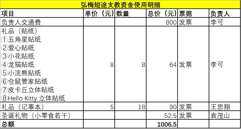 款项全部用于志愿者活动中送给同学们的平时课堂奖励礼物,给全班同学们的圣诞礼物(包括零食和文具)以及项目负责人的交通费用。