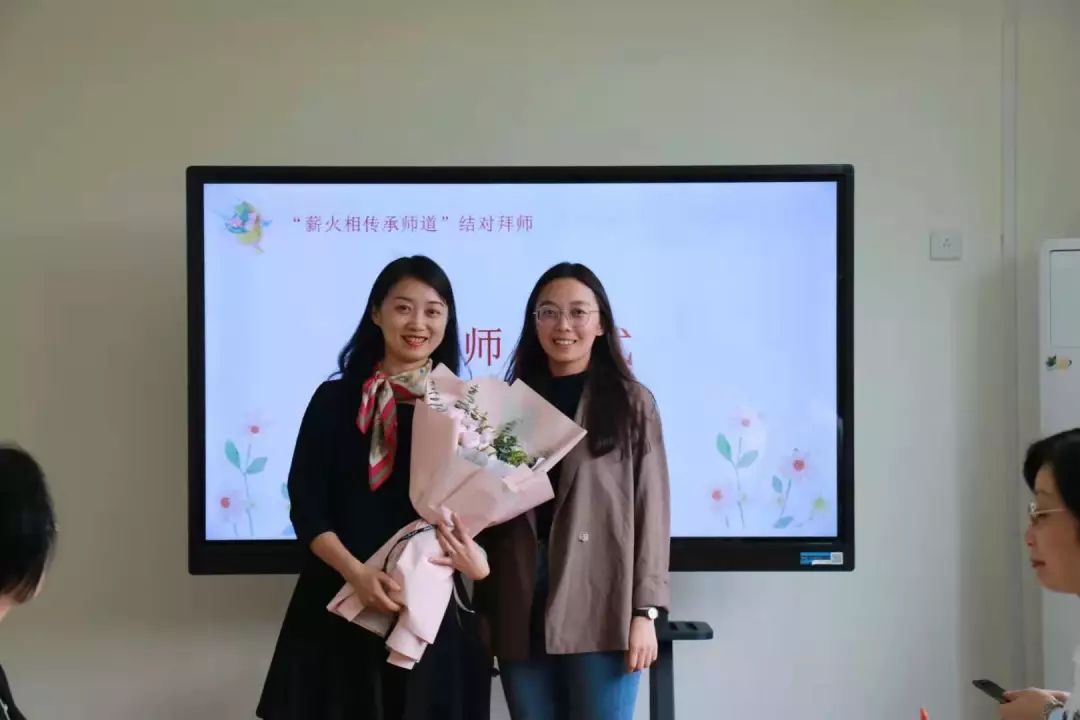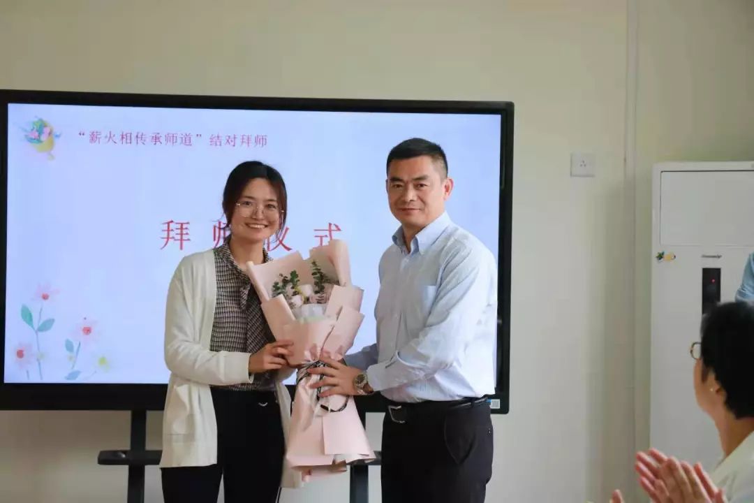 之后各组结对教师依次上台,新老师向自己的带教老师敬献鲜花,承诺见贤思齐,传承师道。带教老师则回赠礼物,希冀新教师牢记初心,记录成长,书写精彩教育人生。