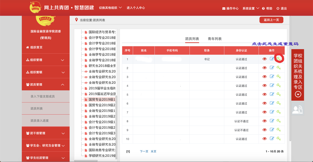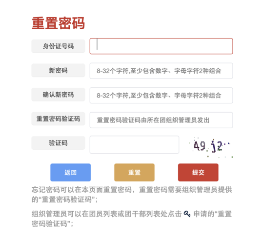 (非团支部管理员查看团干部管理——团干部列表——钥匙小图标;团支部管理员查看团员管理——团员列表——钥匙小图标),拿到“重置密码验证码”后打开系统首页选择“忘记密码”,按照页面提示操作即可。